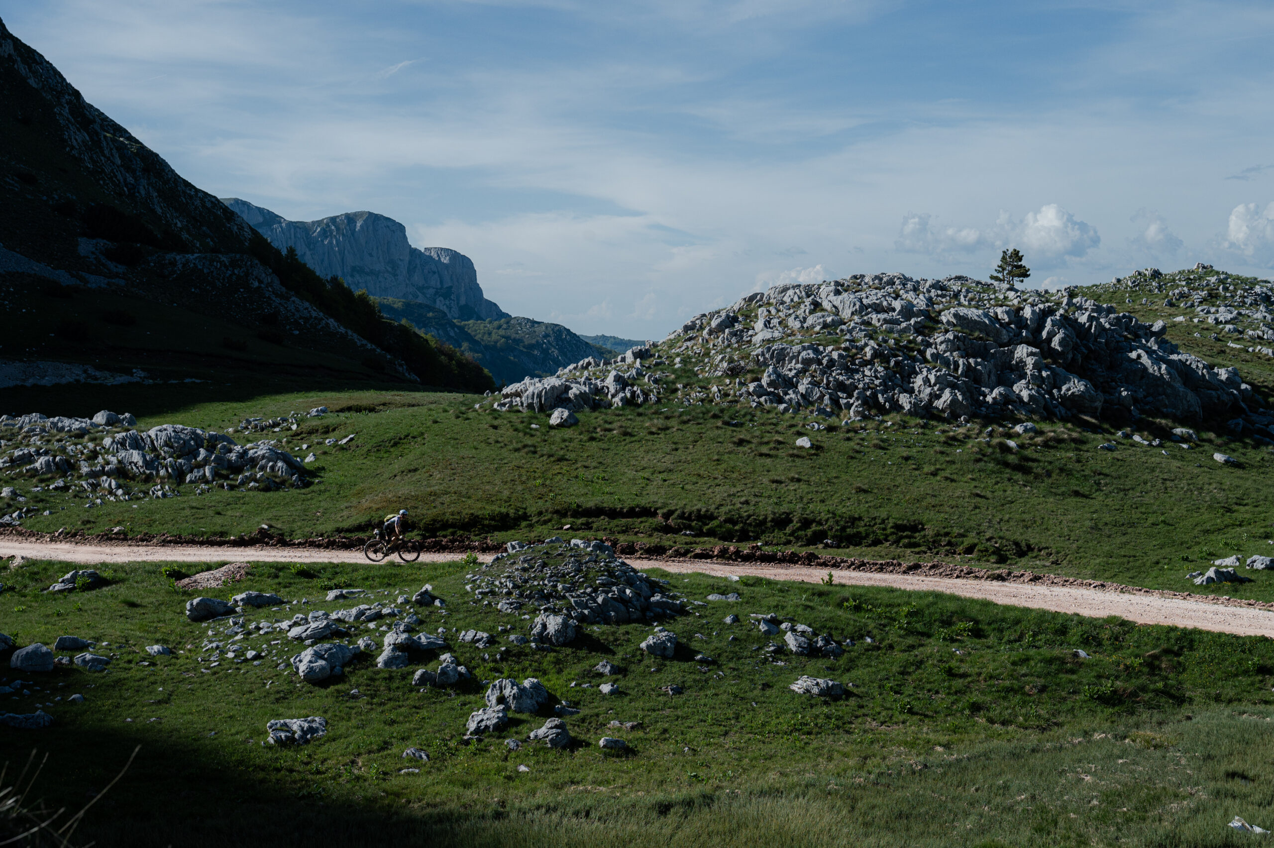 The next frontier is Bosnia and Herzegovina. Riders descend into the wide open Livanjsko Polje, then climb into the Cincar highlands, where wild horses still roam. The track cuts through Blidinje Nature Park before spilling into Mostar — a rare glimpse of civilization, and the lowest (and hottest) point of the route at just 60 m above sea level.